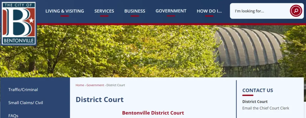 The Bentonville District Court is a second large department of the courthouse (Benton County District Court, Division 2) it plays and deals with different kinds of cases mostly it deals handles traffic, misdemeanor, and ordinance violations from citations issued within the Bentonville area. In addition, Bentonville District Court handles Civil and Small Claims cases when there is proper jurisdiction.